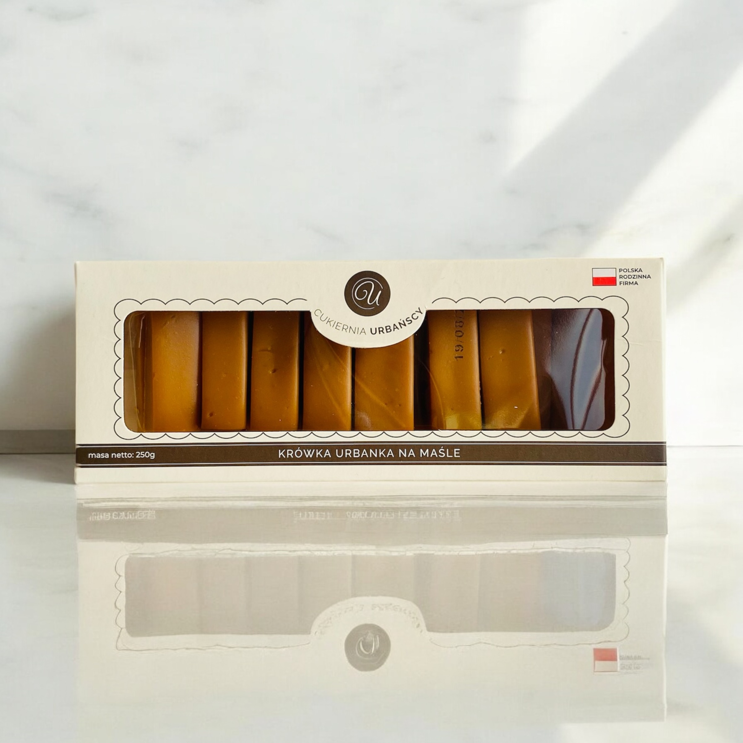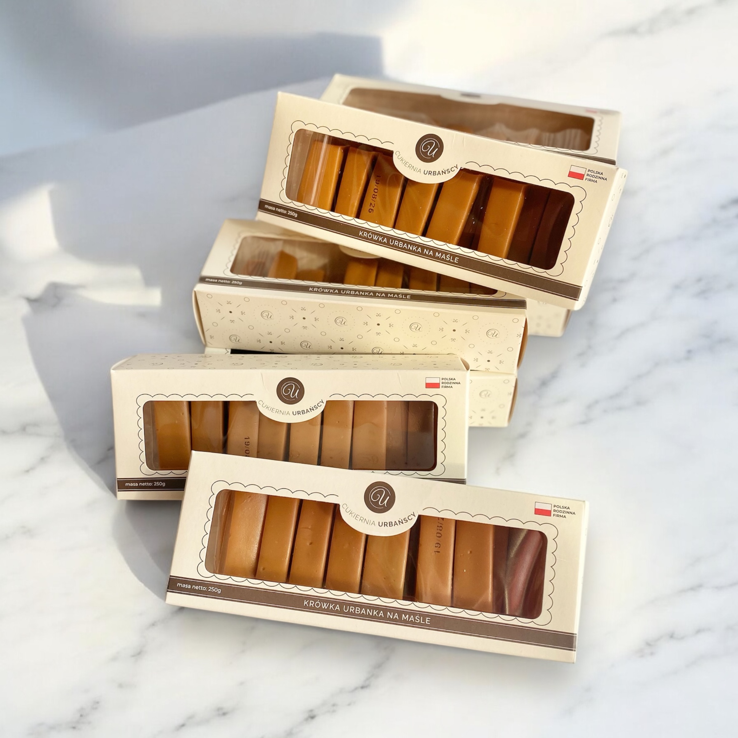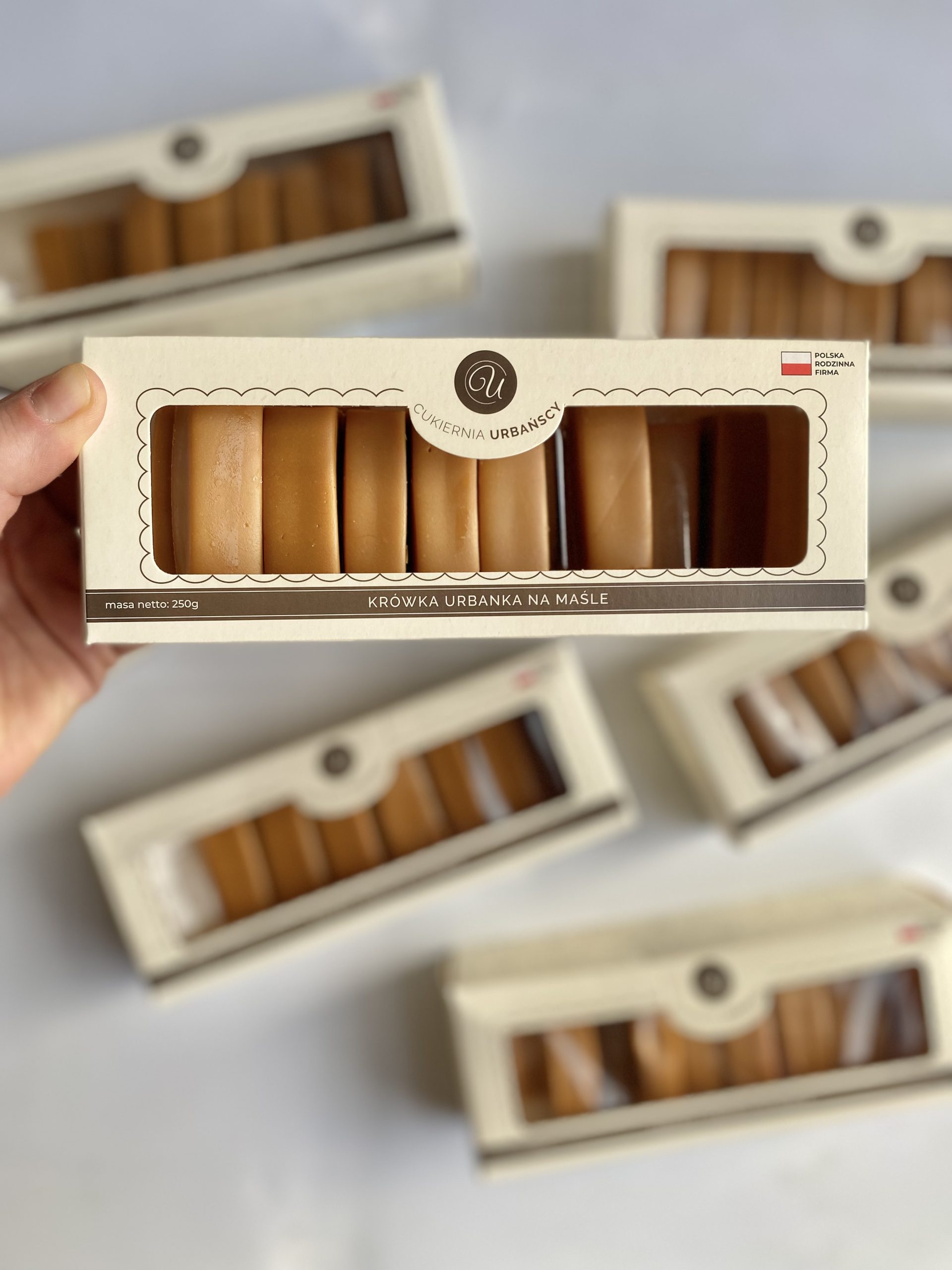 Nasze „Urbanki” są wyrabiane ręcznie. Stosujemy naturalne składniki tj. prawdziwe masło i śmietanę 30%. Krówki nie zawierają konserwantów, aromatów czy sztucznych barwników.