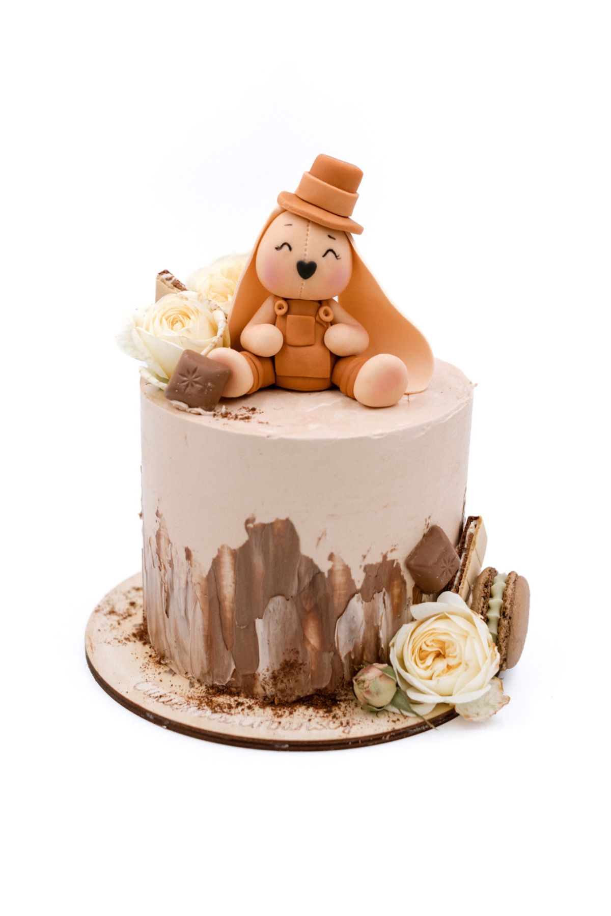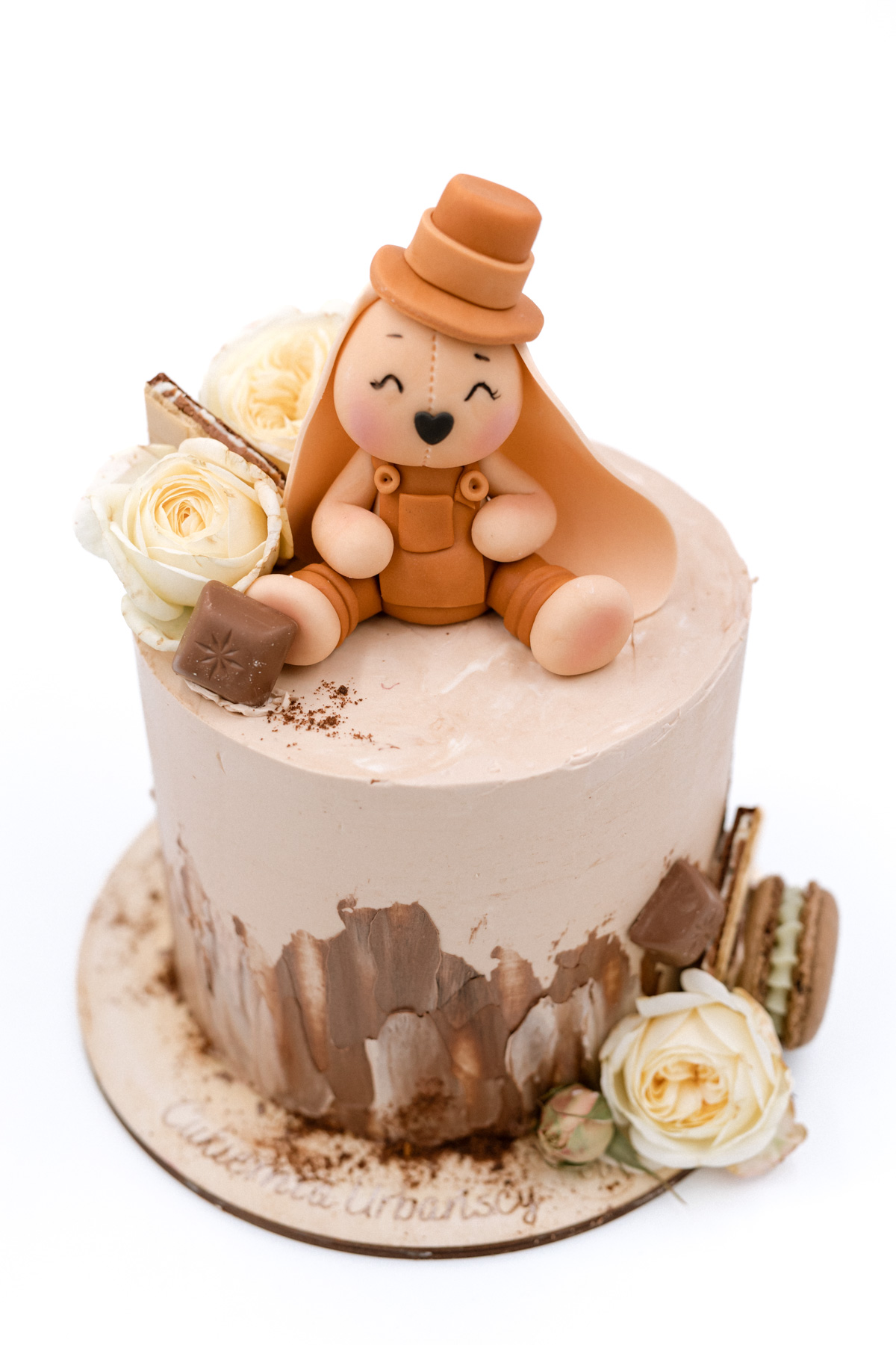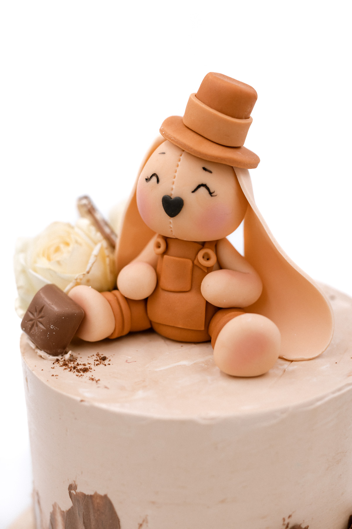 Tort urodzinowy dla chłopca z figurką królika wykonaną z masy cukrowej nie tylko pięknie prezentuje się na stole, ale również wspaniale smakuje. Stonowane kolory i czekoladowe dodatki to coś, co lubią wszyscy. Idealny wybór na urodziny chłopca i nie tylko. Poznaj naszą ofertę smaków i zdecyduj, w jakim wydaniu pojawi się na Twojej imprezie.