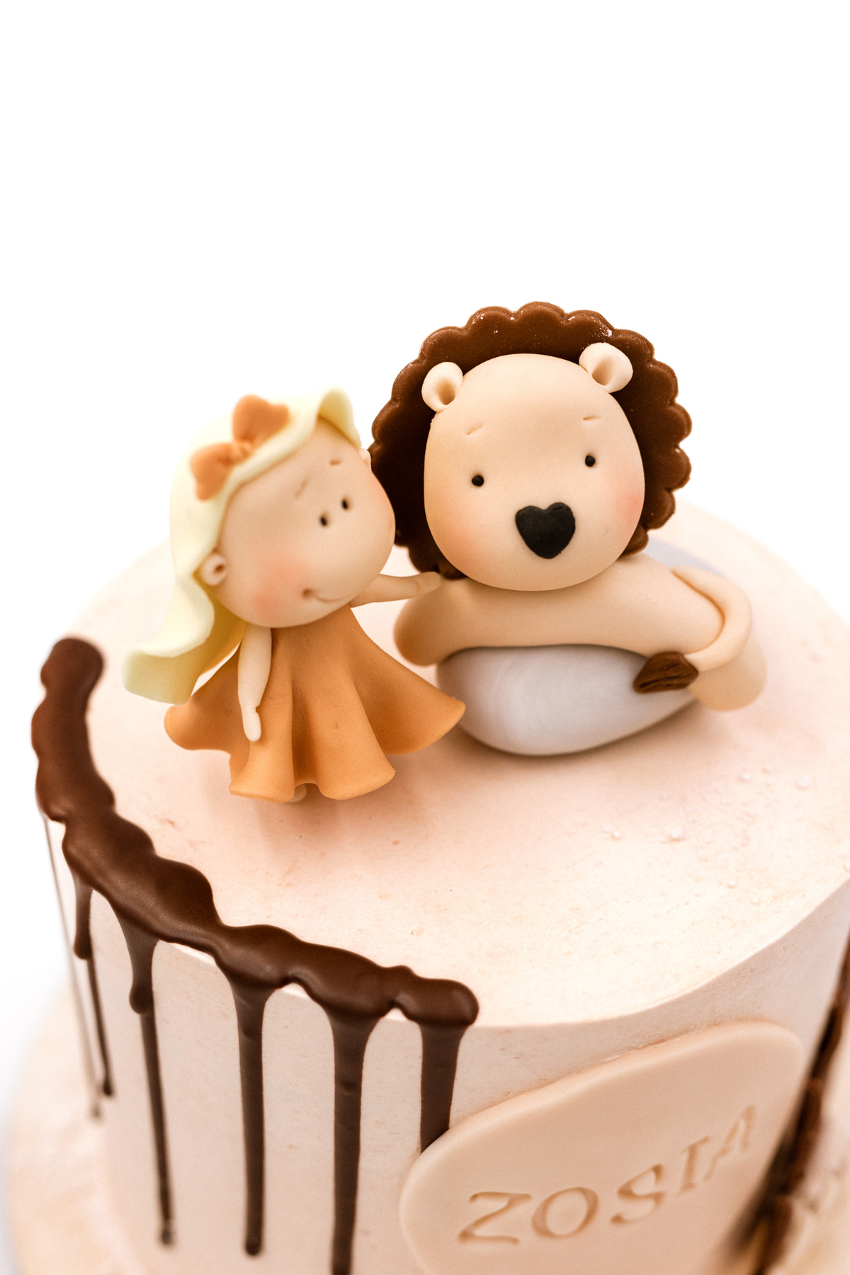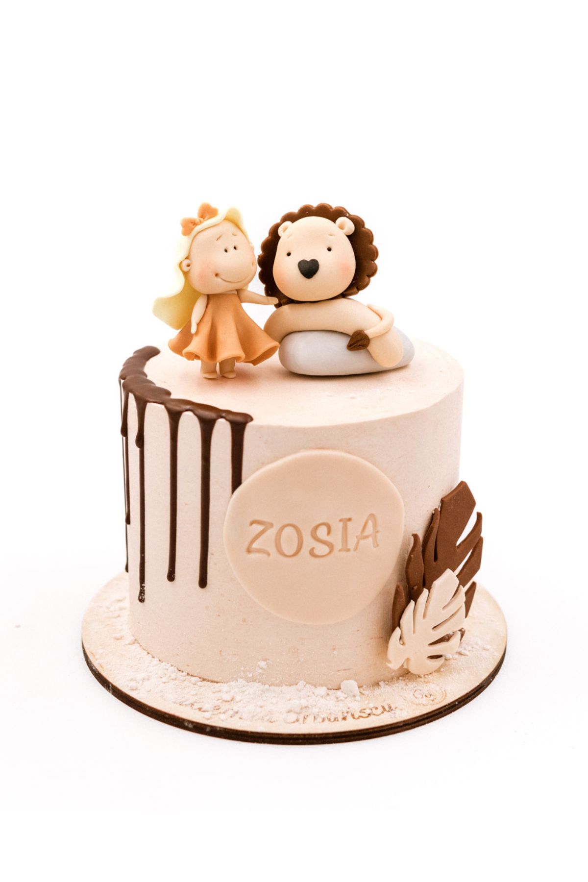 Uroczy tort MAŁA MI przedstawia postać małej dziewczynki i Lwa. Delikatne, czekoladowe ozdoby i stonowana kolorystyka sprawiają, że tort nie jest krzykliwy, a mimo to przyciąga wzrok i zachwyca urodzinowych gości. Ozdoba z masy cukrowej w kolorze tortu, na której możemy umieścić imię dziecka lub dowolny napis, idealnie dopełnia całość, tworząc z tortu wyjątkowe rękodzieło.